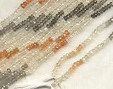 abeadstore , Three colors of glowing Moonstone are strung in color sections throughout each strand. You get sections of grey, peach and white/creamy Moonstone in a faceted rondelle bead shape. Colortones are more vivid in the center of the strands, and is more muted on the ends, as shown by the two strand ends shown in the lower rightof the picture. Hand-faceted beads will be slightly irregularly shaped (as shown). Beads range in diameter from 4.4mm to 5mm. Beads are strung on 14.5 inch long strands. (Read More)